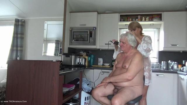 Dimonty coupe les cheveux d'une cliente en portant simplement une nuisette en dentelle transparente qu'elle ouvre pour montrer son corps nu.