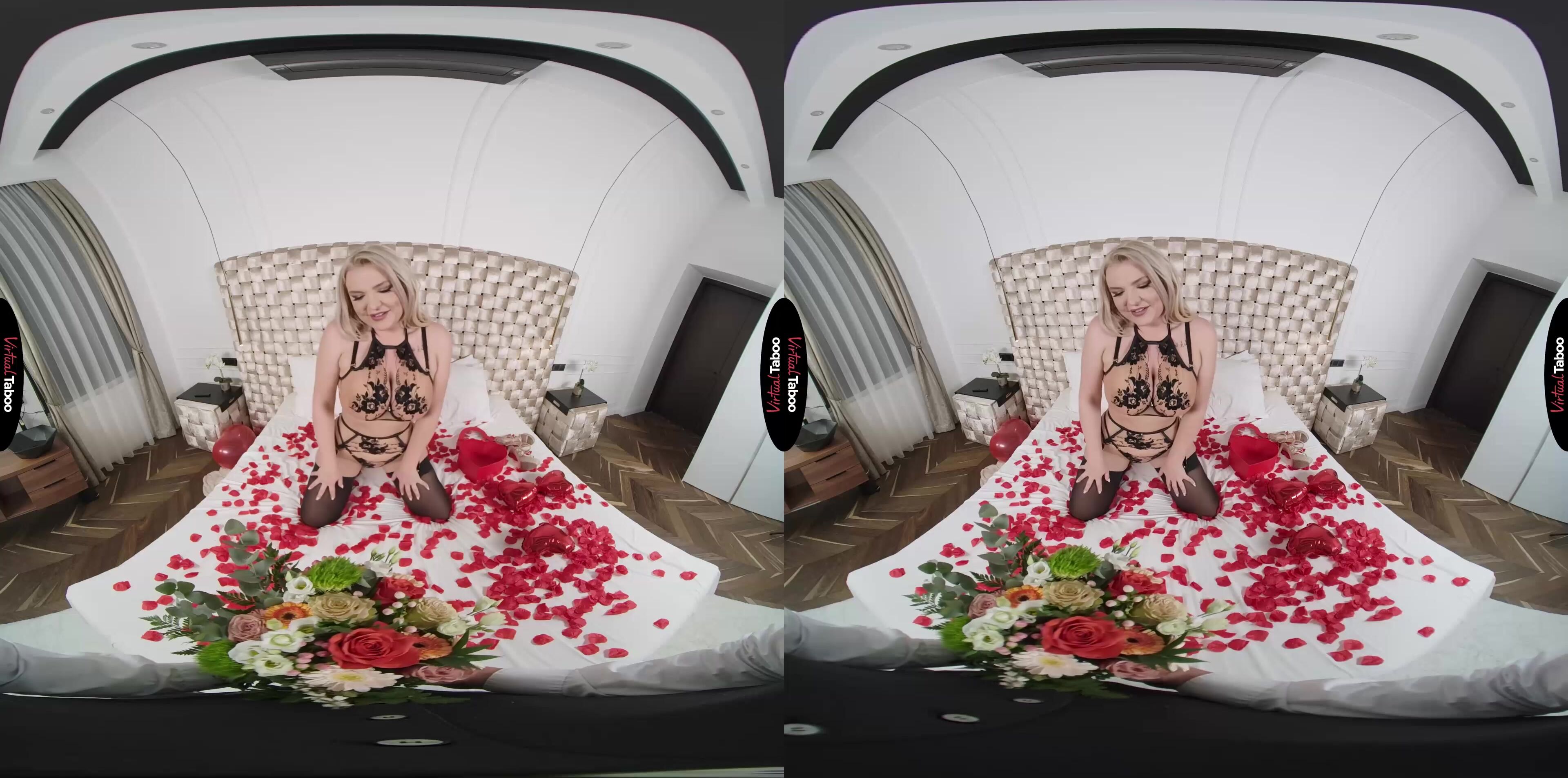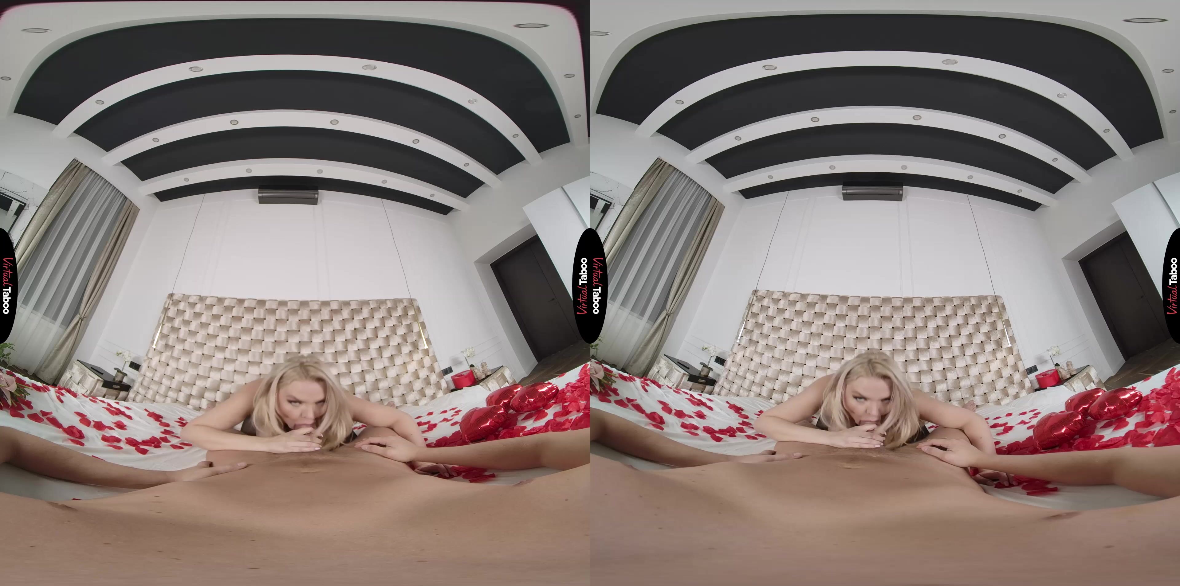 Le beau-fils de Miss Jackson a préparé une rencontre très romantique pour sa petite amie. Pensant que vos parents sont partis pour le week-end, vous avez recouvert le lit de ballons et de pétales de rose et vous lui avez laissé de la lingerie très sexy. Vous avez eu cette idée après avoir regardé des films pornographiques romantiques tabous en réalité virtuelle. Réalisant que vous avez oublié de lui acheter des fleurs, vous sortez et en prenez. Pendant votre absence, Miss Jackson rentre à la maison et voit l'installation romantique et la tenue sexy. Elle suppose que tout cela est un grand geste de son mari et décide de mettre la lingerie et de l'attendre. Quand elle vous voit entrer par la porte à la place, elle est choquée et embarrassée. Elle voit aussi la bite dure dans votre pantalon et ne veut pas qu'elle soit gaspillée. Votre père ne l'a pas baisée correctement depuis des lustres et elle sait qu'elle peut vous faire plaisir mieux que votre petite amie d'université. Vous n'êtes pas sur le point de refuser la tête de votre belle-mère aux gros seins. Elle est habile et désireuse de faire plaisir en faisant disparaître votre viande dans sa bouche affamée. La faisant tourner comme un modèle de porno VR, vous la pénétrez par derrière pendant qu'elle serre les draps et fait tomber les pétales de rose par terre. Voulant essayer quelque chose de spécial, elle vous demande de le mettre dans sa porte arrière. Votre petite amie ne vous laisse jamais lui baiser le cul et vous sautez sur l'occasion de sentir le trou serré de Miss Jackson sur votre barre de poussée. Elle est ravie de votre impatience et de la façon dont votre barre dure la remplit. Vous accélérez, étirant son cul si bien qu'elle est sur le point de jouir. Pour l'aider à se pousser, elle vous reprend dans sa chatte et vous chevauche jusqu'à ce qu'elle atteigne l'orgasme. La sensation est si bonne que vous perdez également le contrôle, en tirant une grosse charge dans sa chatte. C'était plus que ce qu'elle avait prévu, mais vous pourrez vous en occuper un autre jour.