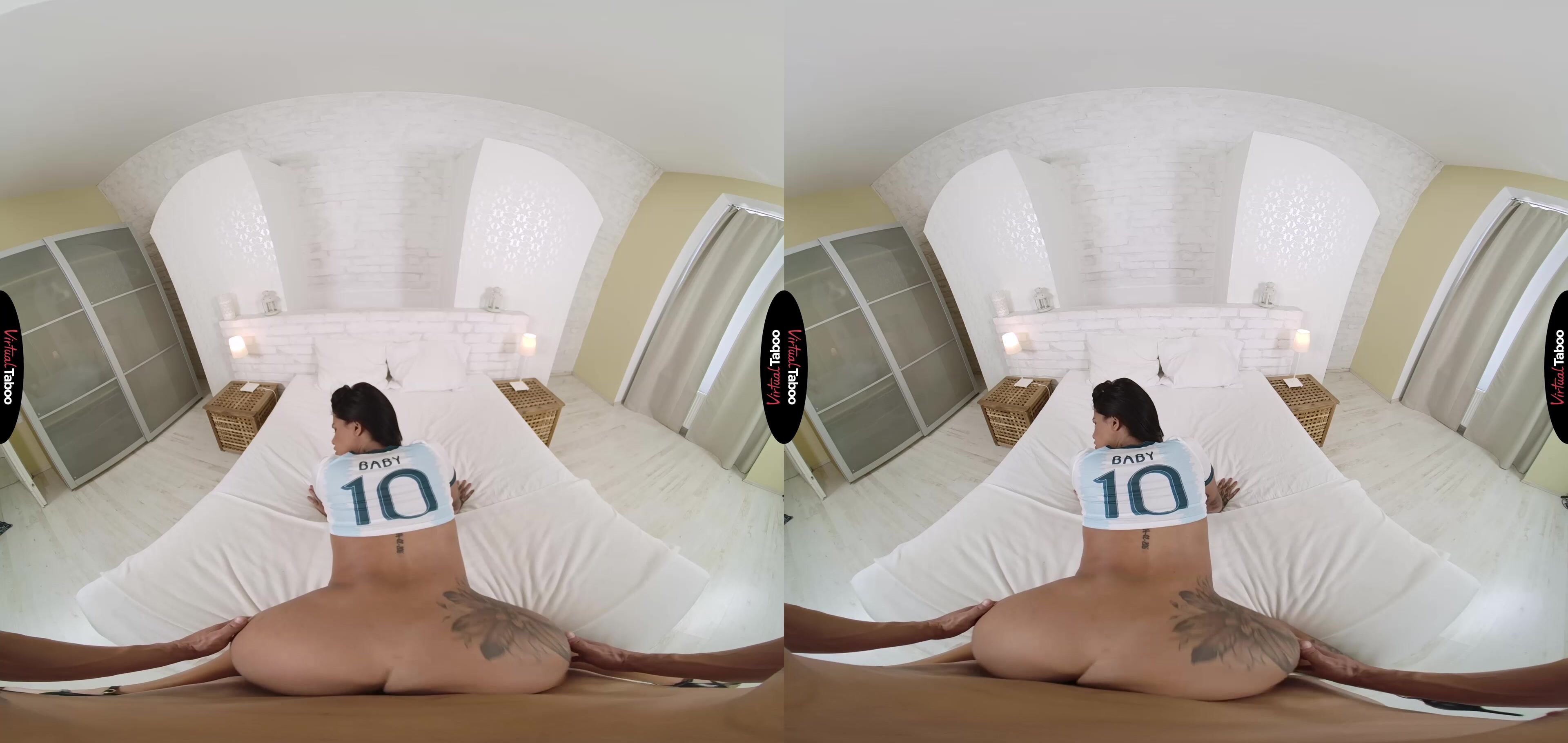 Yorgelis Carillo VR a le béguin pour son beau-père depuis longtemps. Peu de temps après avoir eu dix-huit ans, elle décide qu'elle doit lui faire savoir qu'elle le veut. Sachant que sa chose préférée au monde est le football et qu'il vit et meurt avec son équipe, elle élabore un plan. L'adolescente aux gros seins pense que la meilleure façon d'attirer son attention est de porter les couleurs de son équipe préférée. Elle enfile une tenue qui met en valeur ses courbes et laisse peu de place à l'imagination et commence à prendre des selfies qu'elle prévoit de lui envoyer quand sa mère sera absente. Elle devient coquine avec les photos, montrant son cul juteux dans un short moulant et faisant rebondir ses seins et agissant comme un mannequin porno VR professionnel. Yorgelis ne vous entend pas lorsque vous entrez et la surprenez. Vous ne pouvez pas croire ce que vous voyez, mais vous n'arrivez pas non plus à avoir la grosse érection dans votre pantalon. Vous adorez sa tenue et vous voulez être à l'intérieur de votre belle-fille sexy dès que possible. Elle est choquée par la taille de ta bite, mais elle est heureuse de la prendre dans sa bouche et de te montrer qu'elle sait comment faire plaisir à un homme. Tu aimes tellement sa tenue que tu lui fais la garder, en baissant le short juste assez pour baiser ses trous serrés par derrière. Tu le lui donnes bien, la faisant gémir et crier à chaque poussée. Elle veut s'assurer que tu veux la baiser à nouveau alors elle enroule ses seins autour de ta bite et pompe jusqu'à ce que tu sois prêt à exploser. Il n'y a aucune chance que sa mère puisse faire ça et elle ne te laisserait jamais jouir sur ses seins comme elle le fait. Elle est la gagnante et revendique avec joie son trophée de meilleure salope de football.