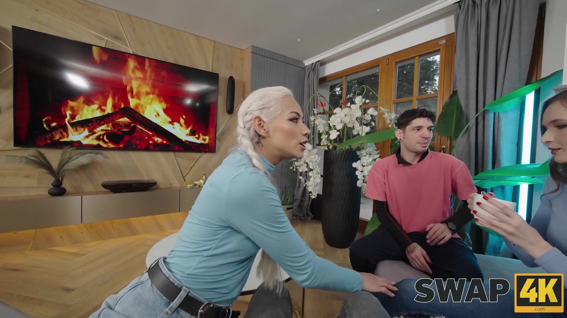 SWAP4K. Une jolie fille aux beaux seins nous a pris pour les propriétaires du château et nous a rejoints pour un plan à trois.