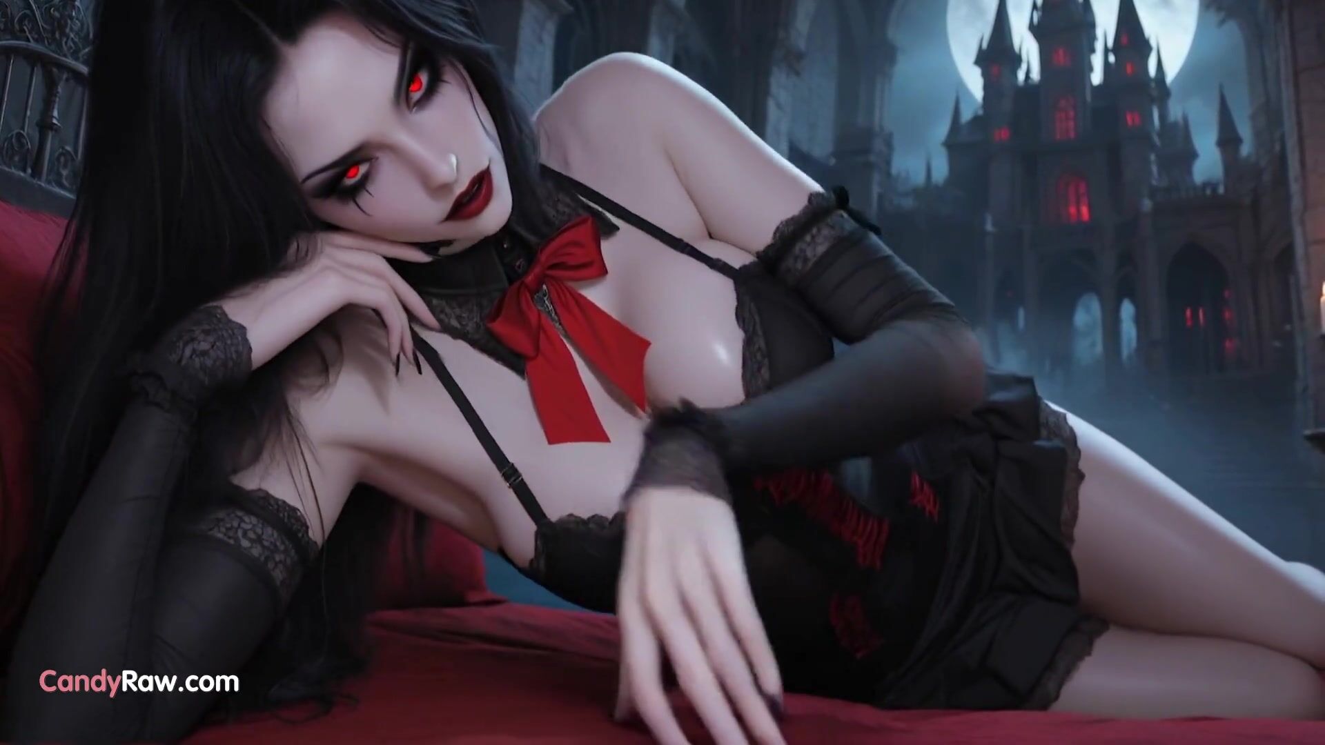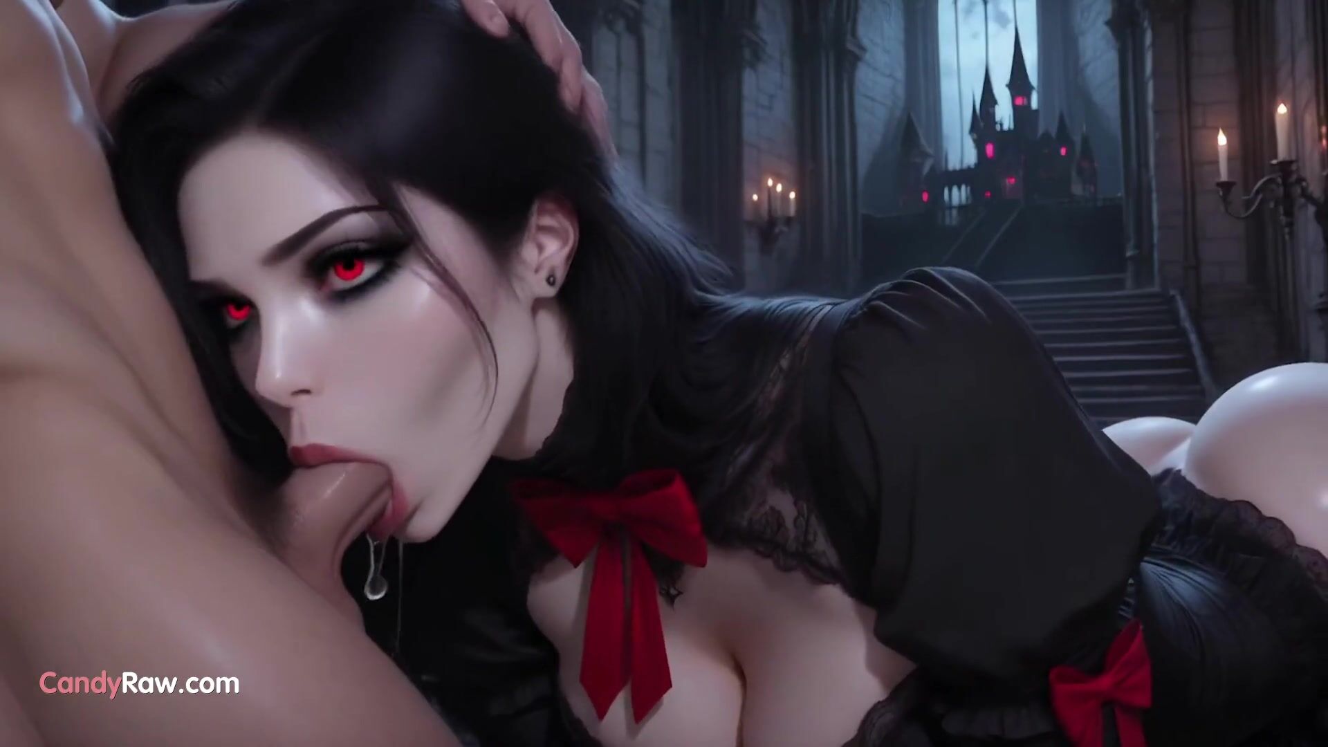 Une beauté ténébreuse aux seins généreux et aux fesses rebondies se dévoile dans un corset noir transparent et des bas, dans un château gothique inquiétant. Une vampire sulfureuse suce un gros godemichet jusqu'au fond, puis se fait prendre sauvagement par un étalon en missionnaire, à quatre pattes et en levrette. Un gros pénis dilate son vagin serré avant de la remplir d'une énorme giclée de sperme. Une scène de sexe animée et hardcore.